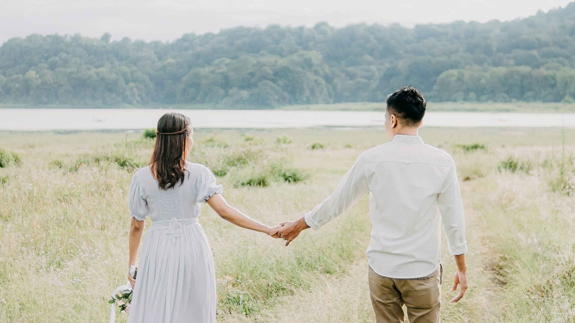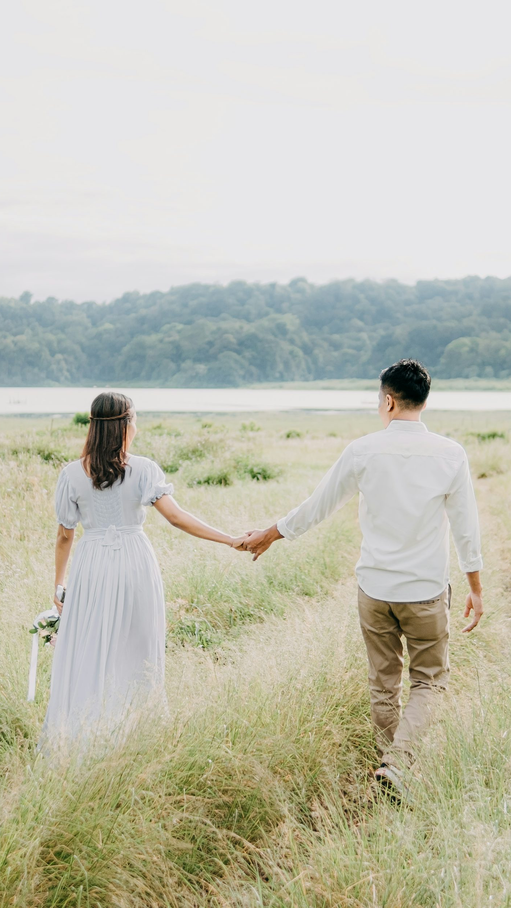 Keywords: man, woman, couple, holding hands, walking, tall grass, field, nature, love, romance, togetherness, outdoor, scenery, landscape, serenity